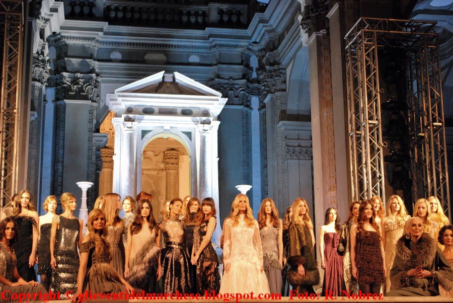 Sulle note della musica ecco uscire dal retro dell’altare marmoreo 30 modelle speciali ed eterogenee. Facciamo qualche nome: l’attrice Sarah Felberbaum, Martina Colombari, la fashion blogger Chiara Ferragni, la ex modella americana Carmen Dell’Orefice (80 anni portati splendidamente), l’attrice americana Marisa Berenson, Camilla Belle, Matilde Borromeo, Alessia Piovan, Katy Saunders, la schermatrice Nathalie Moelhaussen.