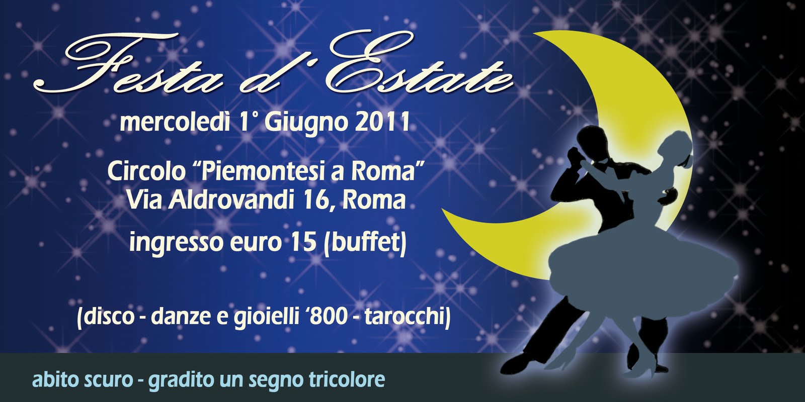 Nella splendida terrazza del Circolo dei Piemontesi, in via Aldovrandi 16, immersa nel verde di Villa Borghese, ballo d’estate al ritmo di musica dance anni ‘70,’80 e ‘90 e balli d’epoca, cartomante, caricature, mercatino di gioielli antichi, degustazione di vini Piemontesi…e tanto altro!