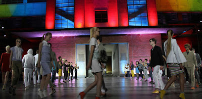 In passerella le proposte di Scott Sternberg uomo e donna sulle note del musical West Side Story e Singin in the Rain. Sono proprio gli anni 80′ ad essere il leit motive della collezione. Bande ubane, formate da ballerini professionisti “ribelli e sfrontati”, si sfidano per la conquista della ragazza più bella da corteggiare sulle note dei famosi musicals.