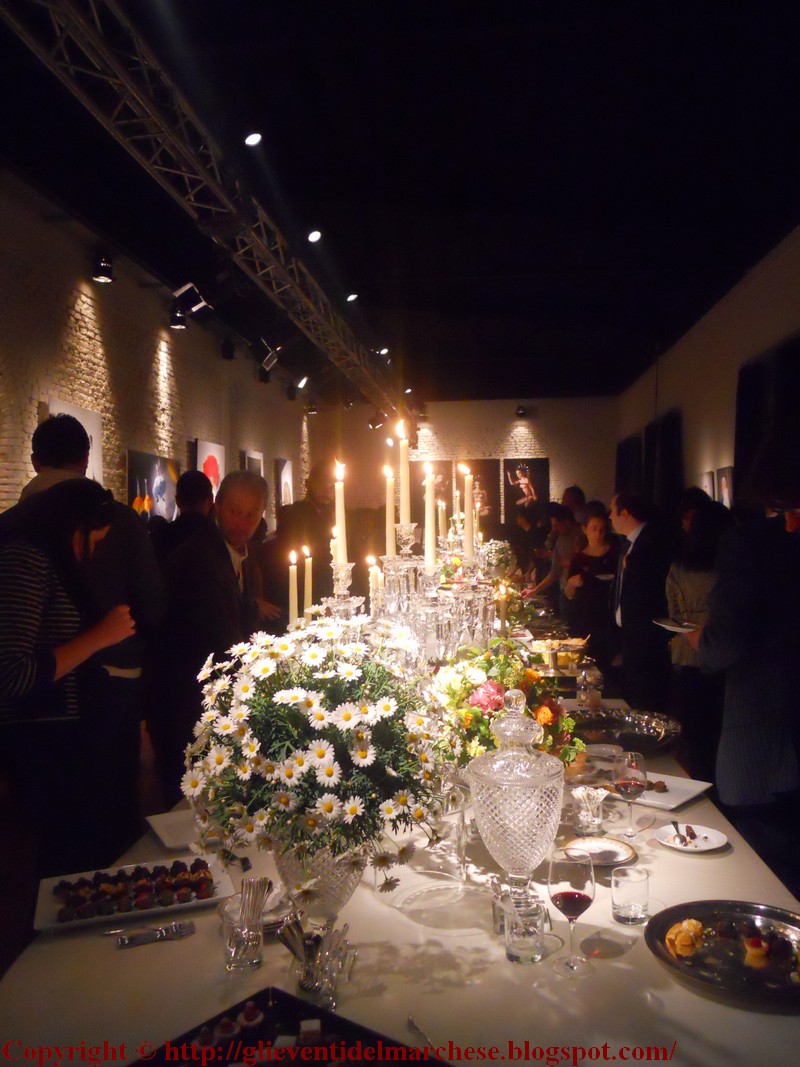 Ma siamo rimasti particolarmente affascinati e sedotti dall’allestimento dello spazio Uoll dedicato ai dolci. La tavola delle meraviglie, una vera scenografia barocca. Le caldi luci delle candele si rispecchiavano nei cristalli dei candelabri e dei vasi. Fiori colorati e profumati che facevano da contrasto al purpureo bianco di piccole e delicate margherite.